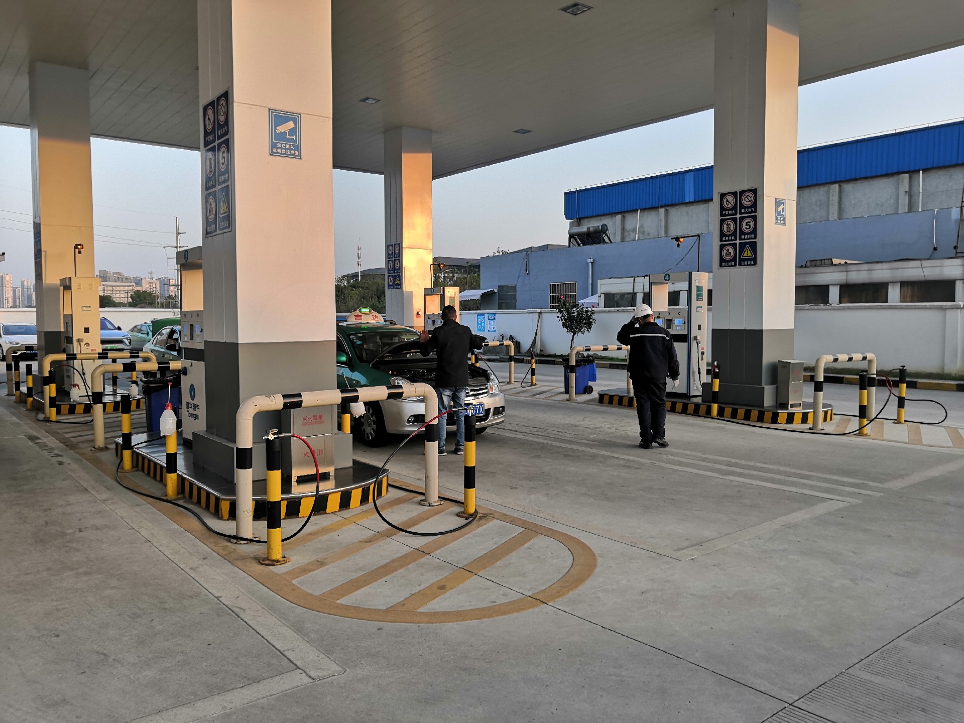 项目基本情况 | 常州蓝焰港华燃气有限公司宣塘 CNG 加气站是一家新建CNG加气站,隶属于常州蓝焰港华燃气有限公司,法定代表人秦臻,主要负责人孟起,企业性质为有限责任公司分公司,经营场所位于常州市钟楼区中吴大道18281号,该加气站于2019年08月06日取得了常州市钟楼区市场监督管理局《营业执照》(统一社会信用代码:91320404MA1YUJRA9C)。营业执照经营范围:能源技术咨询与服务;能源设备租赁;自有资金对清洁能源与节能减排项目的投资建设;合同能源管理;燃烧设备及节能设备的销售、安装;压缩天然气和液化天然气的销售(限《燃气经营许可证》核定范围)。 常州蓝焰港华燃气有限公司宣塘CNG加气站项目总投资1224万元,占地面积2110m2,主要包括配电房、控制室、营业厅、空压机室、办公室等;设立CNG 撬装压缩机2台、储气井4口(总容积12m3)、 CNG 双枪加气机4台等主要设备、设施;同步实施相关配套工程;项目建成后形成2.5万Nm3/d天然气(CNG)加气能力。 生产过程中主要存在火灾、爆炸(容器爆炸、其它爆炸)、触电、车辆伤害、高处坠落、机械伤害、物体打击、灼烫、中毒和窒息、噪声等危险有害因素。 | |||